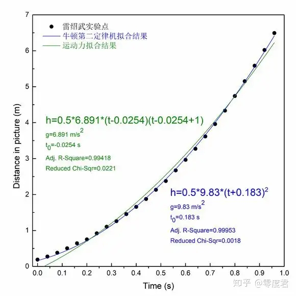 经过一系列的操作之后,分别用牛顿力学公式和“运动力公式”拟合了下落过程,如下图。结果发现“运动力公式”带入后t0(开始计时时已经下落的时间)居然是负的,加速度g也和雷老师预测的不一样。直接导致了雷老师再一次修改了公式。也就是本小节开头的那个公式。