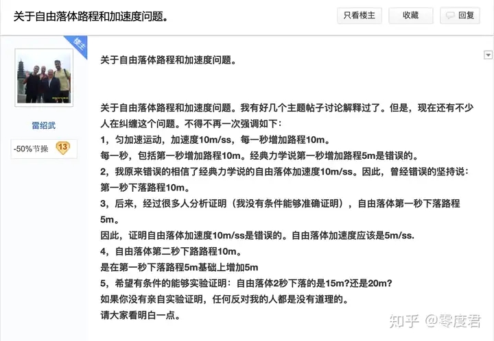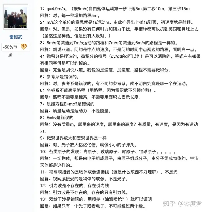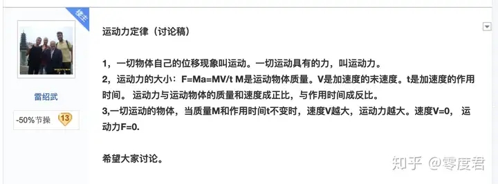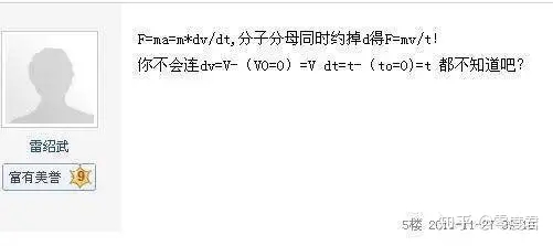 雷绍武是民科吧物理学代表之一,贴吧里一般亲切的称为雷老师。雷老师的主要代表作是“运动力”理论以及衍生出来的运动学理论。简单来说就是“运动就有力”,运动力单位是L(贴吧称为雷)L=kmv,k是常数。
