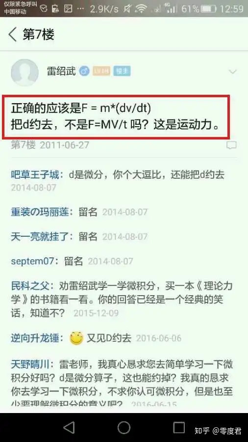 作为民科吧的长期吧宠(现已经失宠),雷老师留下的笑话足够再写N个,不过有一个是我一定要写的就是传说中的约d。由于雷老师不懂微积分,所以把微分算子当做未知数给约掉啦