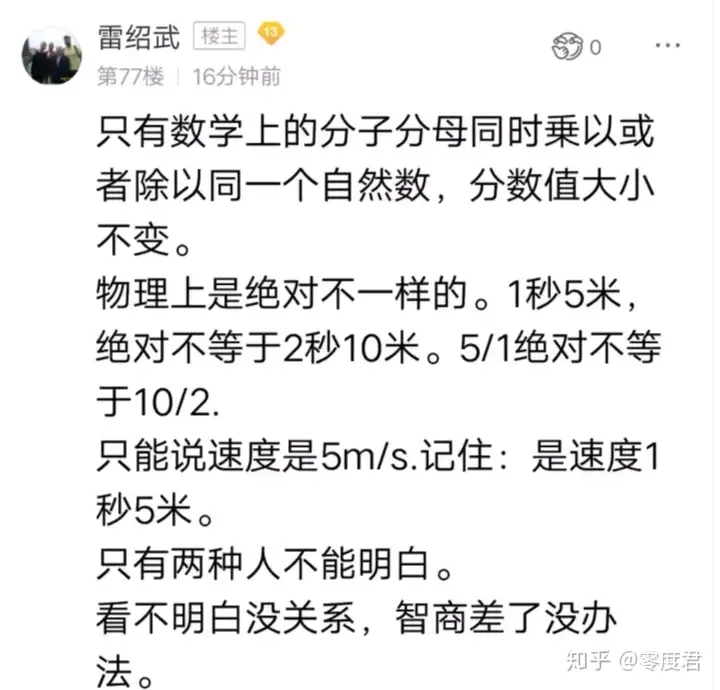 雷绍武认为在数学上分子分母同时乘以或者除以一个自然数分数值大小不变,在物理上这规律不对。比如他认为:
