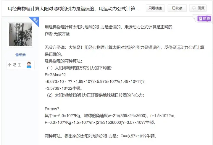 雷绍武认为使用牛顿力学计算太阳对地球的引力是不正确的,他的推论过程如下: