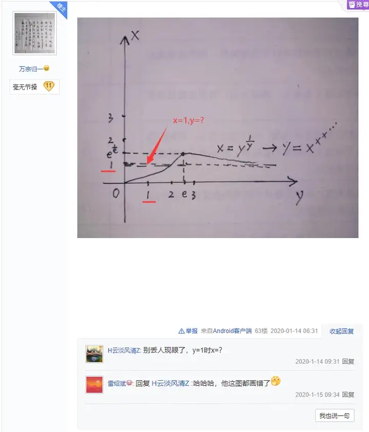 王为民深深的掉入之前的那个坑中,以为y=xx就是方程limk→∞kxx=x的解。还很自以为是的画了函数图像......