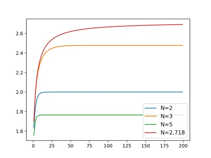 下图中蓝色、橙色、绿色、红色分别代表N=2,3,5和2.718时kNN随着迭代次数k增大时数值的变化。显然,仅有N=2是一个巧合。而且我们也看到了,其实最起码在x>1时这个函数是当x越接近e时limk→∞kxx值越大的。