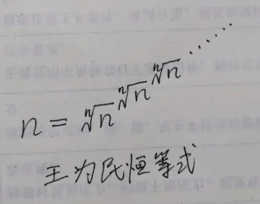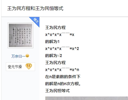 所谓王为民方程,其实就是xxxx...=x的解为x=1,其实这就是所谓的迭代幂次,数学上应该表示为limk→∞kx 。(例如4x=xxxx )。