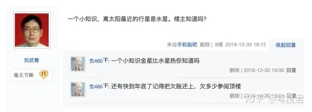 在贴吧,刘武青有个外号就核动力复读机,因为他的回复大体上只有这么几个类型: