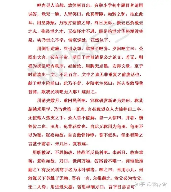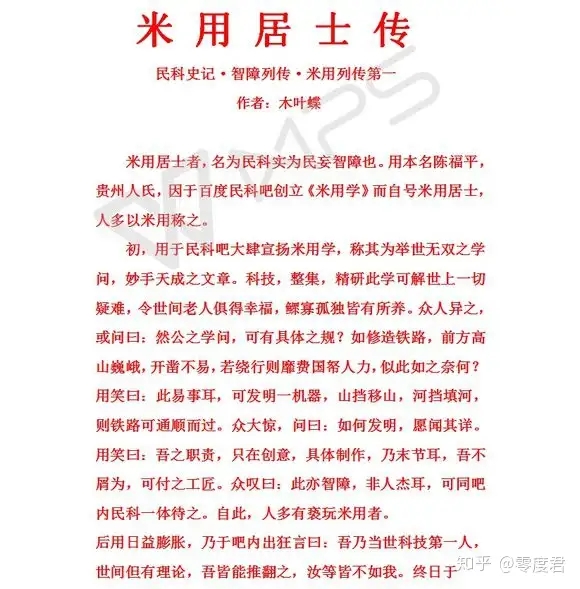 木叶蝶,自封木叶君,性别貌似男,不知何处籍贯,文笔极佳,曾经使用白叶若羽这个ID(被某民科认为是妹子并大幅度骚扰,当然这是后话了),代表作米用居士传,内容如下(侵删)