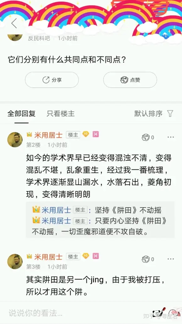 米用此人在民科吧里算是后辈,零度君留意到米用的时间还是远远落后于雷绍武等人的。但米用可以算是民科吧里的绝对另类,因为他是民科吧里貌似唯一一个没有任何理论的民科。