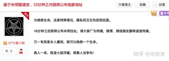 春小树发了这个么贴子,表示出于拯救米用生命的考虑如果米用不在10分钟内回复将公布其家庭住址。别问我米用的家庭住址怎么被搞出来的,民科智商普遍偏低,连身份证(没打码)都被人套出来过。
