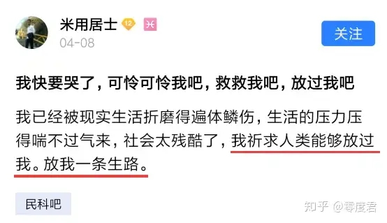 米用的生活看起来是蛮艰辛的,因为他经常在民科吧发这样的帖子: