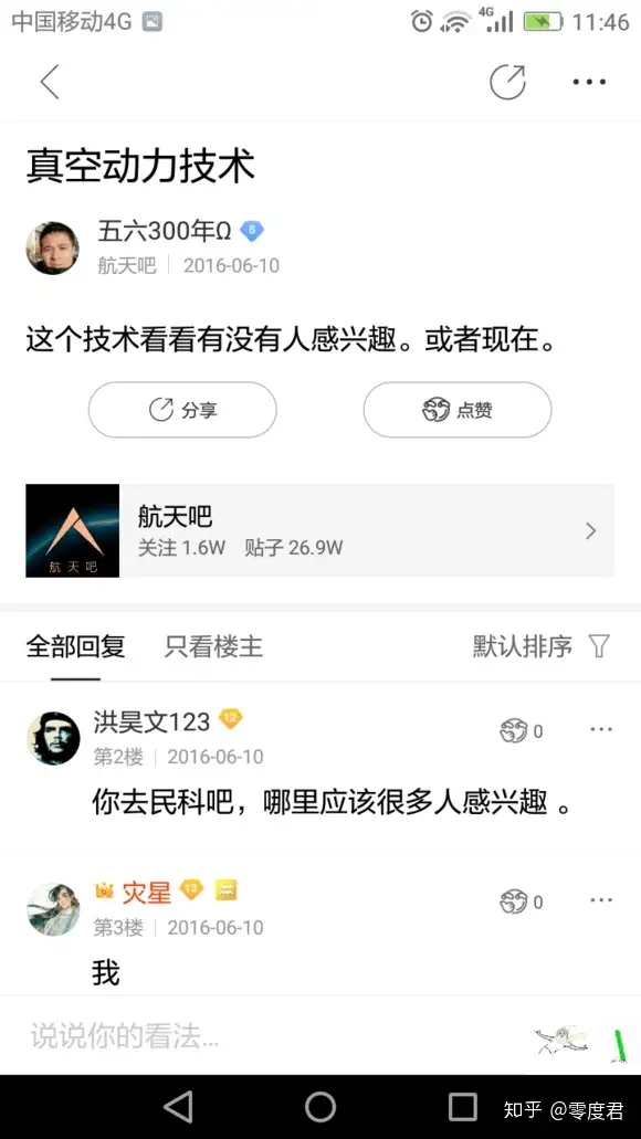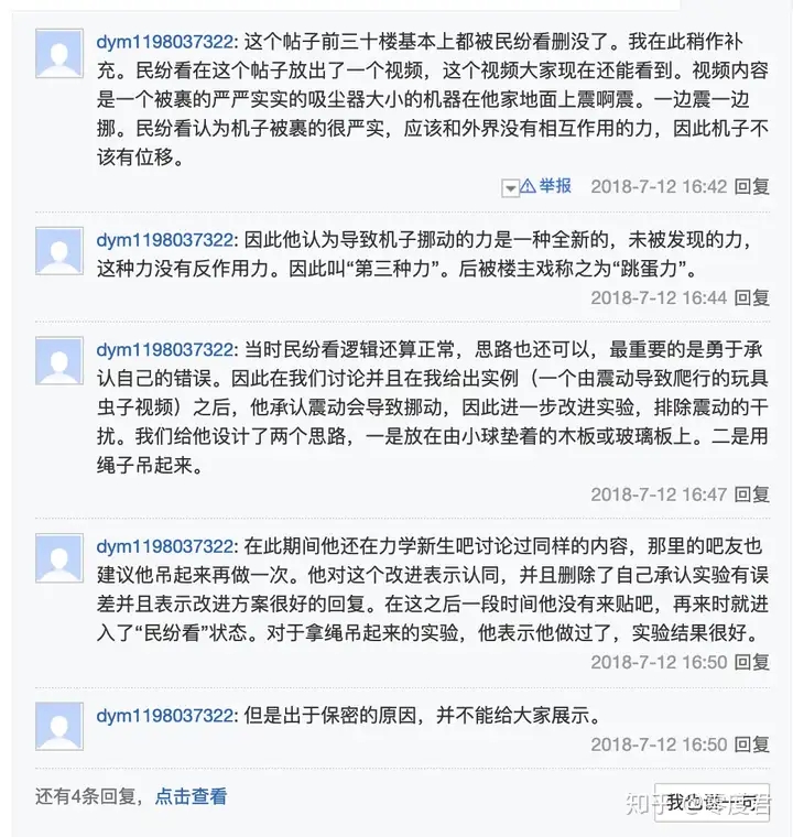民纷看开始成为民科的时间已经不可考,但民纷看与民科吧之间的渊源还是完全可考的。史料记载,民纷看在百度贴吧首贴发表于航天吧,时间是2016年。恩,用来推广所谓“真空动力技术”。二楼的洪昊文123很幸运的成为了民纷看的启蒙老师,成功把民纷看拉进民科吧。