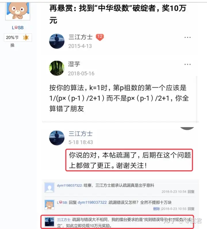 其实,这已经不是三江第一次发悬赏贴了,之前有个超过1000楼的悬赏贴,大意是悬赏10万求中华级数破绽之类,因违反吧规被炸楼。当然,以三江的尿性,即使真有人来打擂他也会死皮赖脸的不给你钱的,比如: