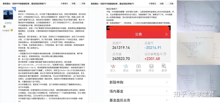 三江通常在被怼的无路可走的时候会选择发悬赏贴,一般内容不过是“悬赏10万找中华级数破绽”之类。比如下面这个就是三江今天看到零度君的这个专栏后愤怒不已却又因为友善度问题被知乎封禁后发表于民科吧的。还附上了三江的股票来证明他有钱。